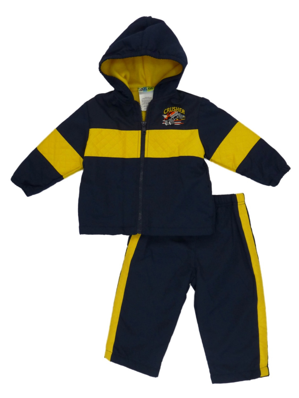 This stylish baby boys 2-piece track suit set is fleece lined and includes a hooded jacket with embroidered Monster Truck "Crusher" design and matching pants.