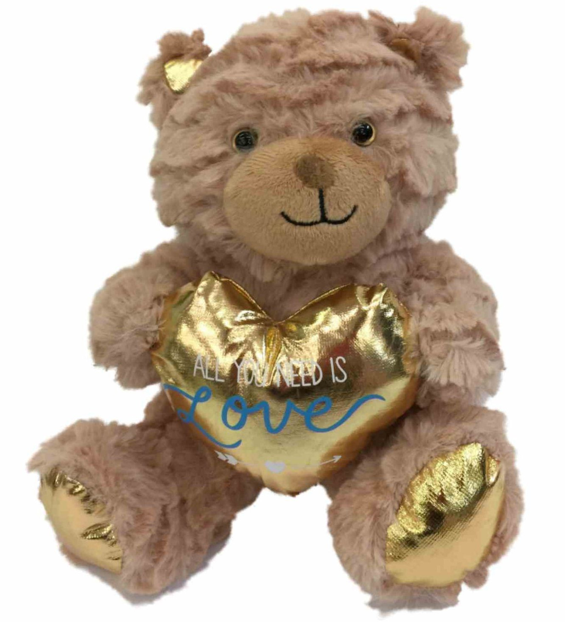 - Cute teddy bear holds a gold heart shaped pillow that says "All you need is love"