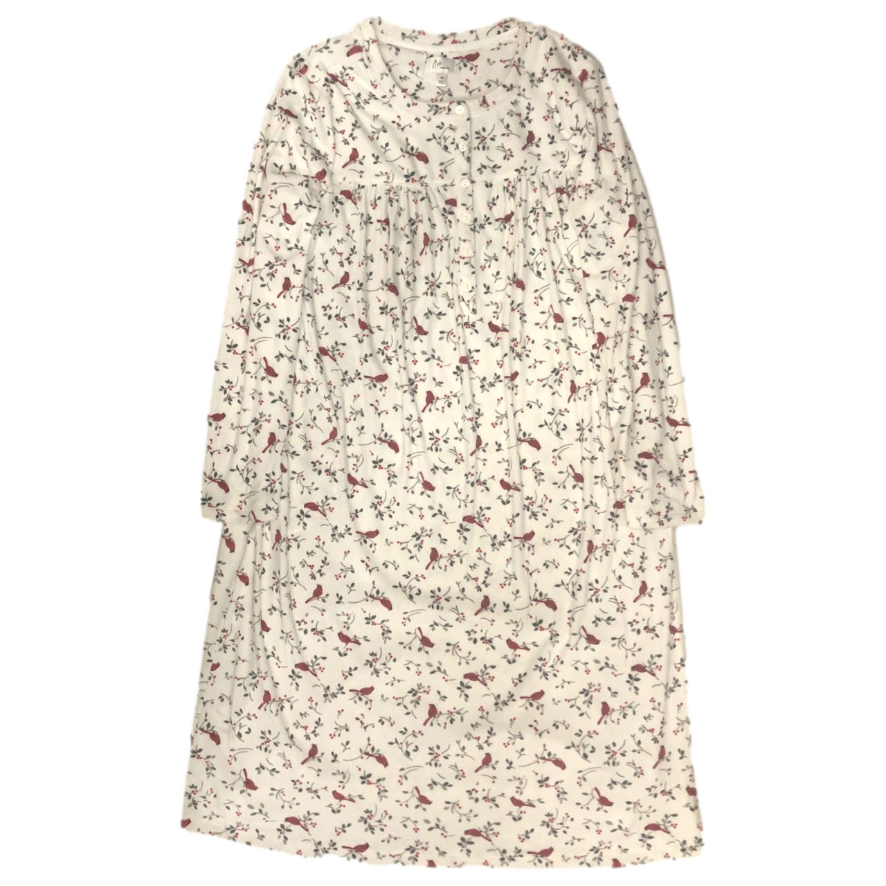 This velvety soft cardinal print long sleeved nightgown is perfect for bedtime. It fall about mid-calf on most people and has 2 side pockets.