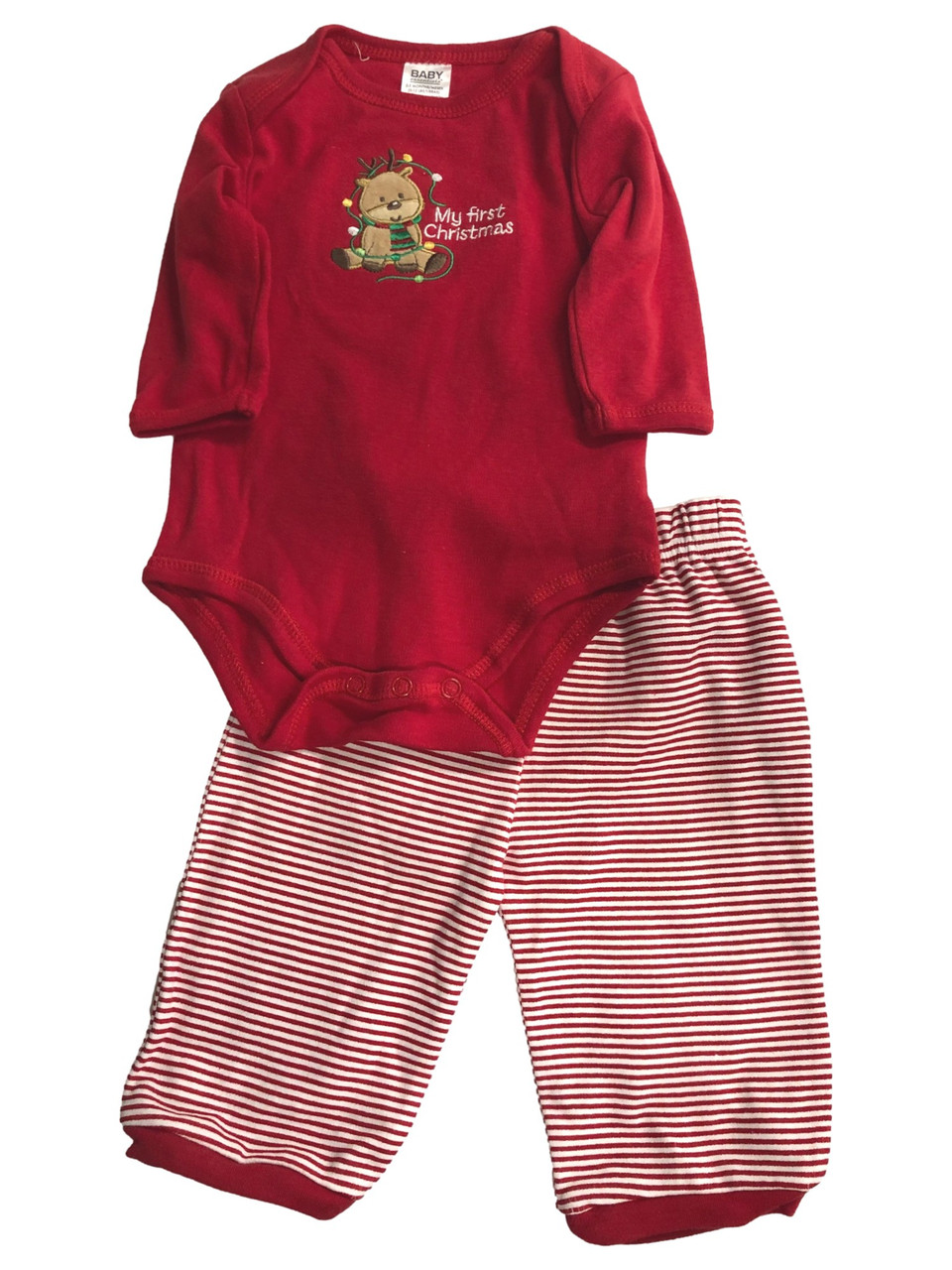 Your little one will look adorable in this fun red reindeer themed "My 1st Christmas" baby outfit with red bodysuit & red striped pants!
