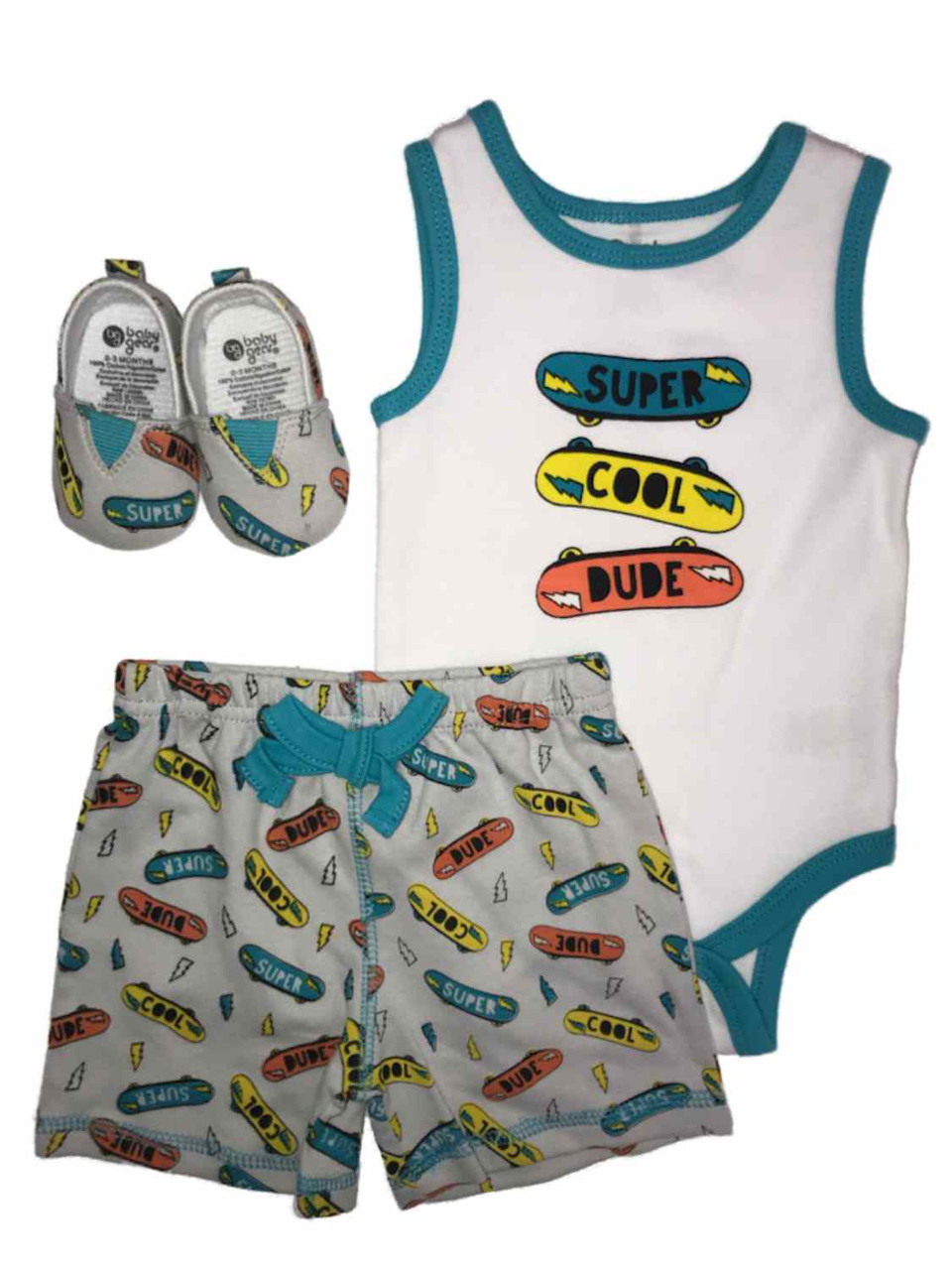 This adorable 3 piece set of baby boys white and blue skateboard "Super Cool Dude" bodysuit, gray skateboard-print shorts set, with matching shoes with skateboards is sure to be a spring or warm weather favorite!