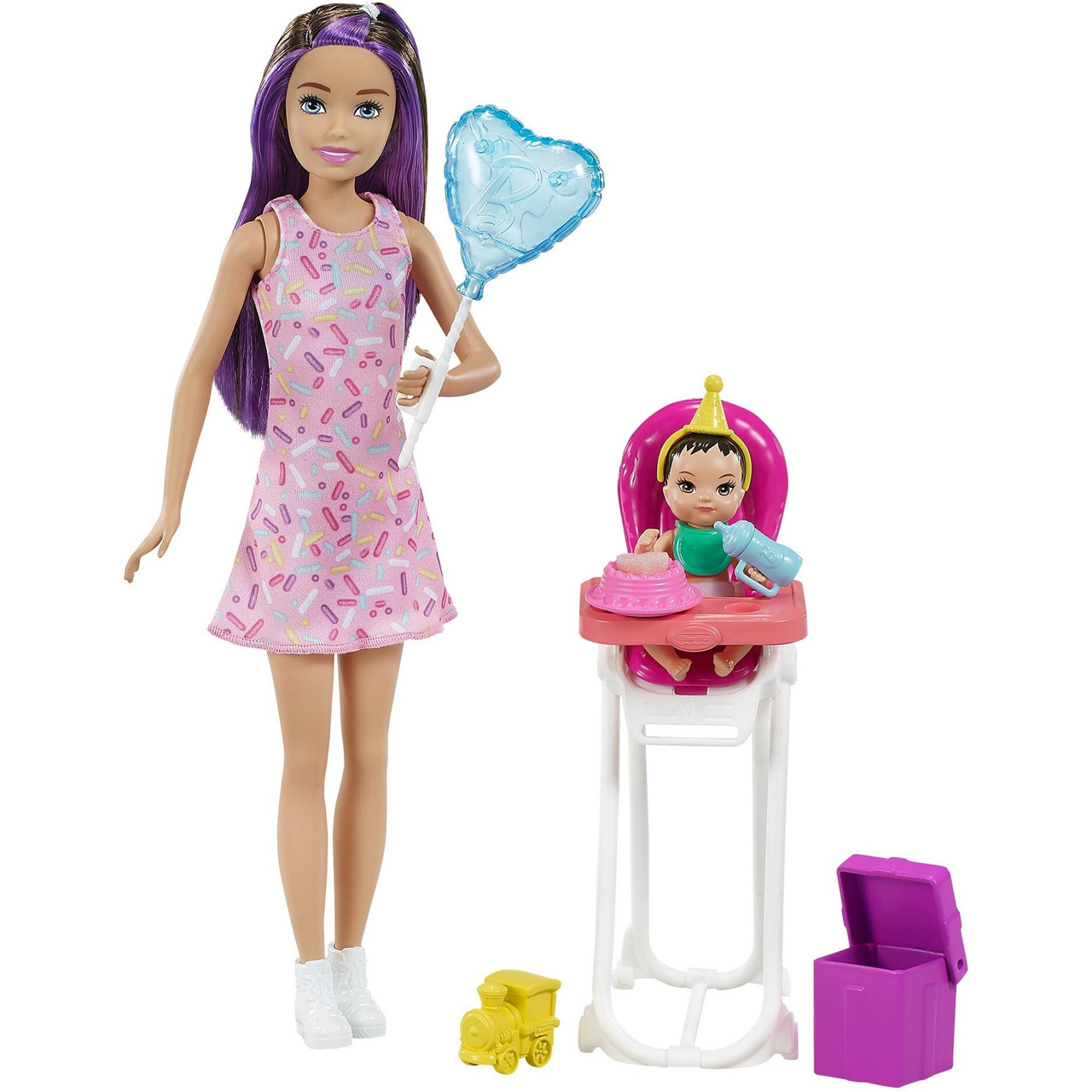 - Barbie Skipper Babysitters Dolls Playset includes baby with color change features, High Chair & Party Items