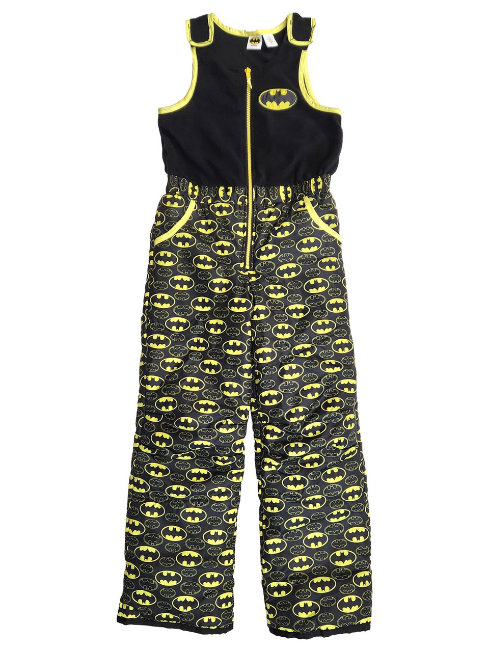 He will stay warm while he plays in the snow in these cool black & yellow Batman snow bibs. They have adjustable shoulder straps, plenty of pockets & leg snow cuffs.