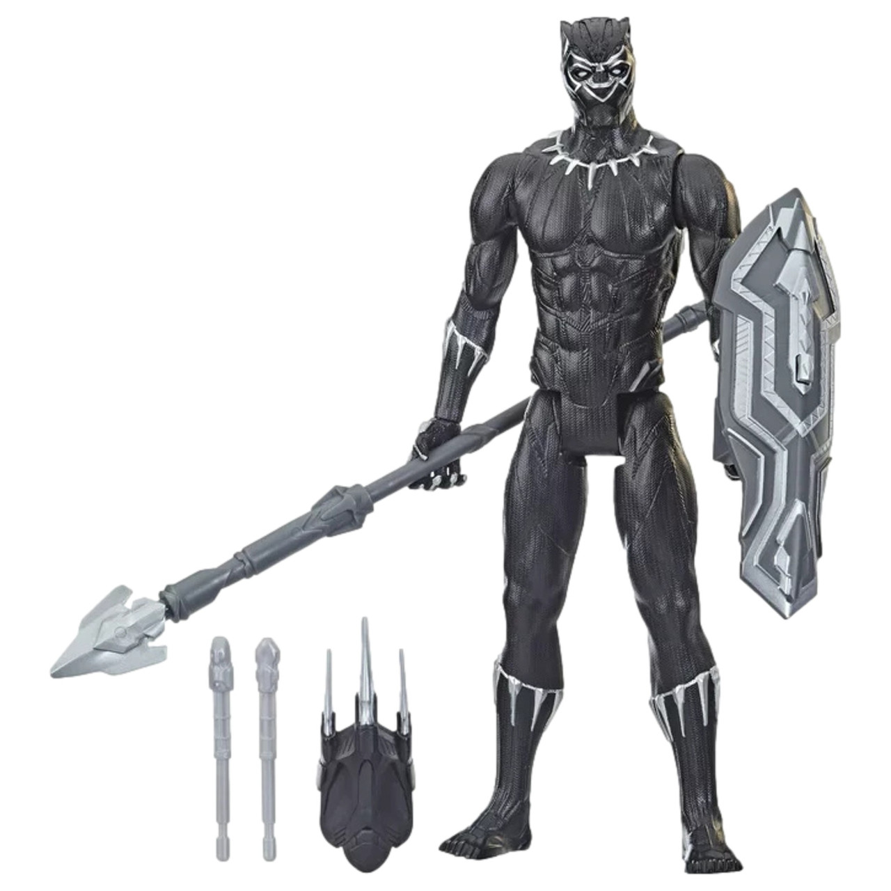 - The Titan Hero Series Black Panther with Gear action figure comes with 3 detachable character-inspired accessories, including claw, spear, and projectile-launching shield