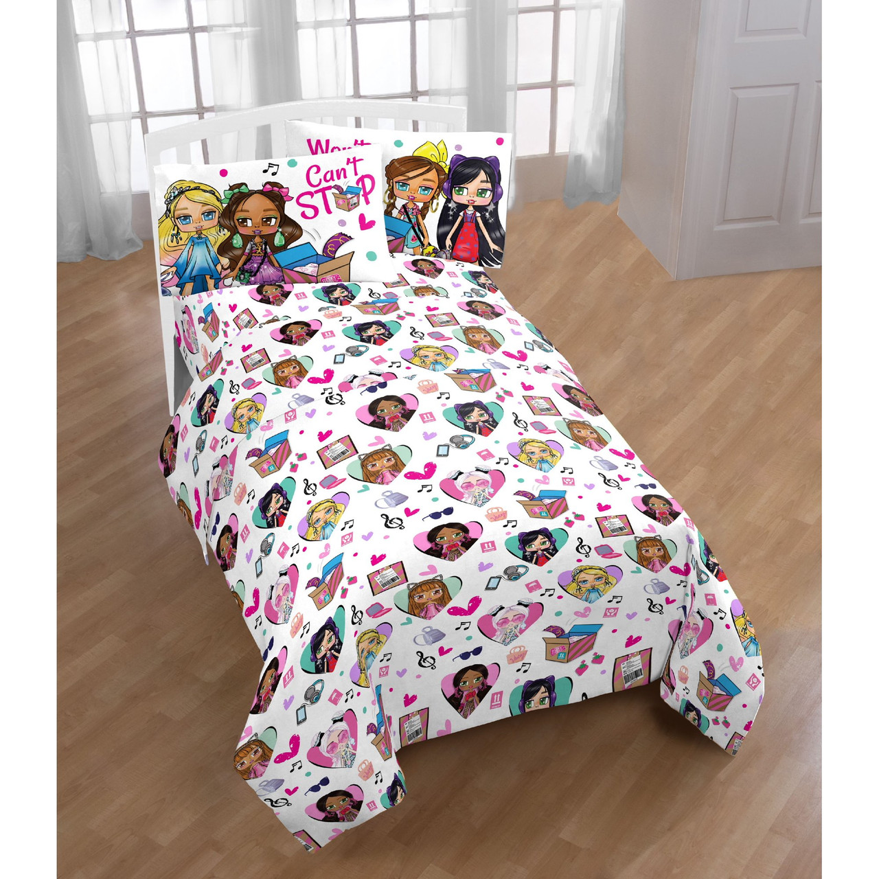 These pretty Boxy Girls sheets feature an all-over boxy girl pattern on a white background. The set includes one flat sheet, one fitted sheet, and two standard size reversible pillow cases. These darling sheets will add a nice touch to your childs room