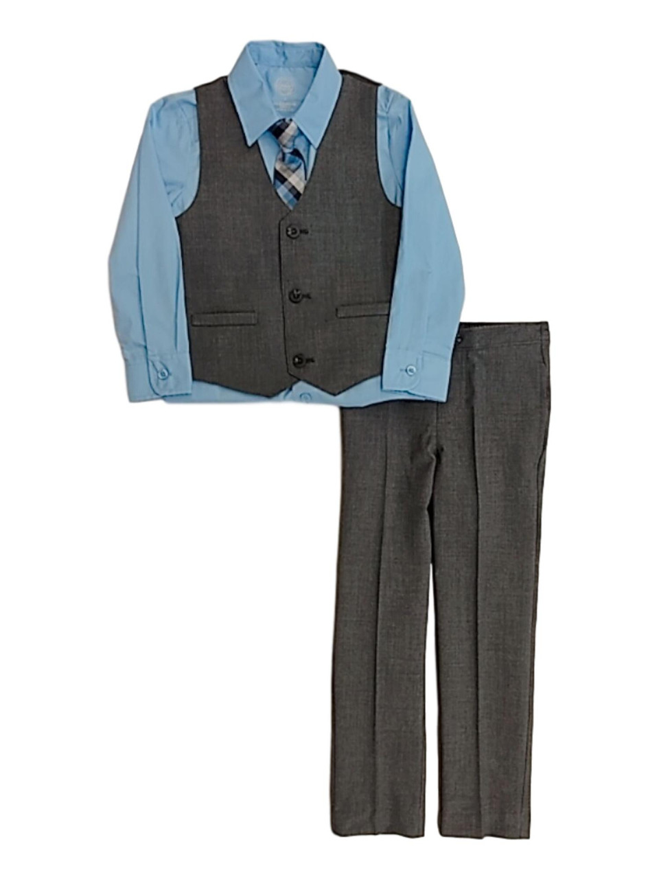 - Boys 4 Piece Set Blue Button Down Shirt Gray Vest & Pants Tie Outfit Set