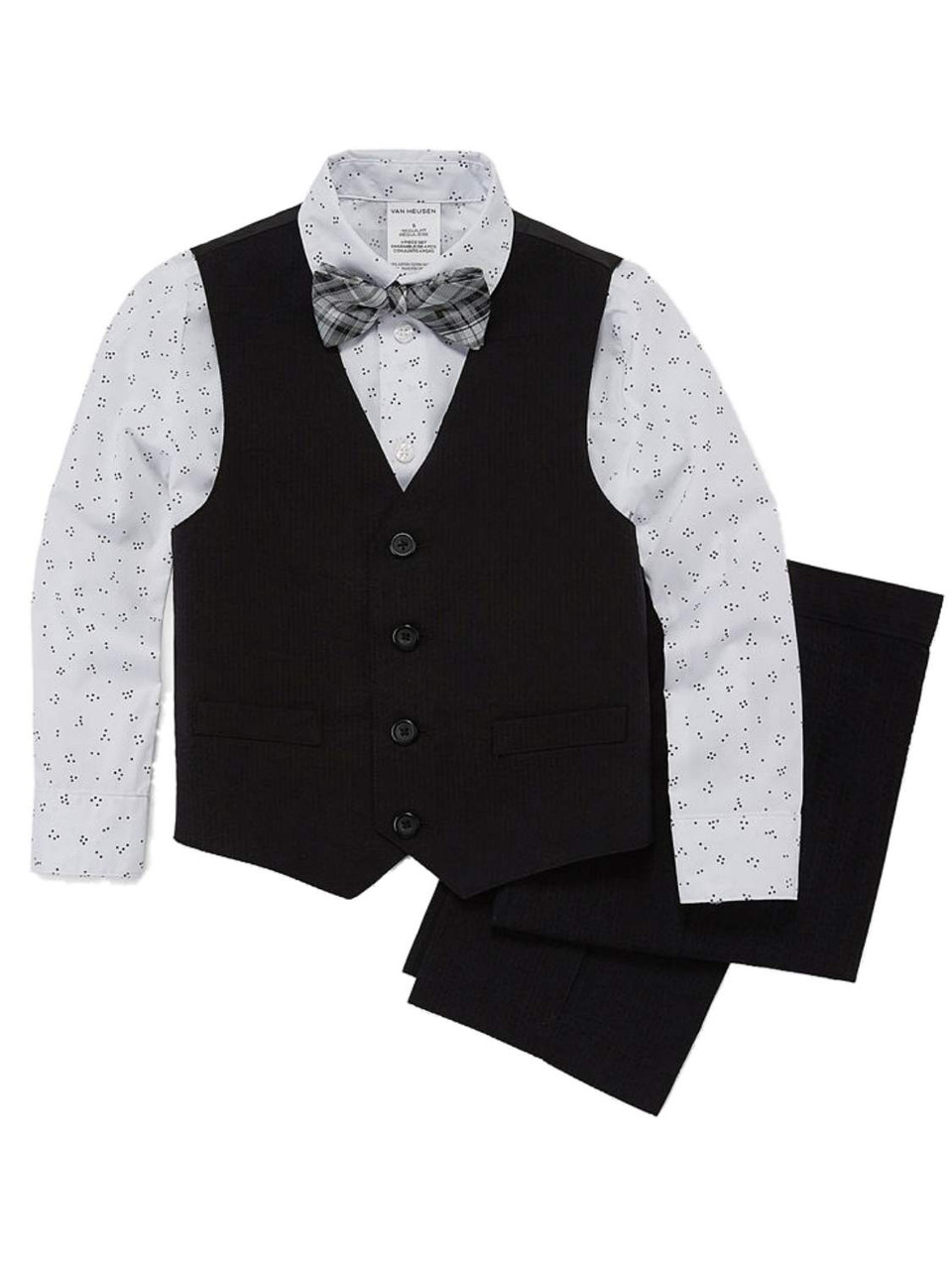 - Boys Black & White 4pc Seersucker Suit Pants Vest Shirt & Plaid Bowtie Outfit