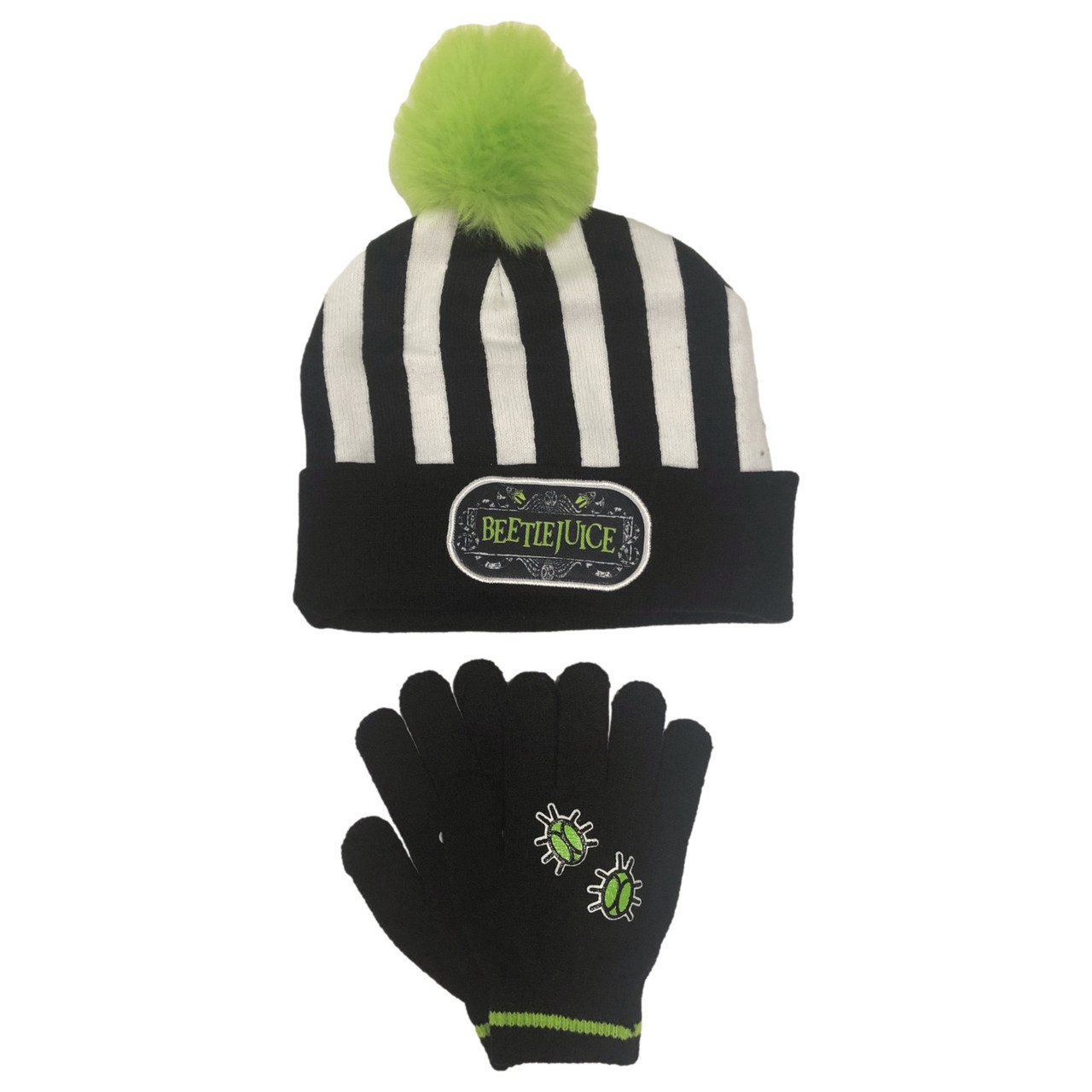 He will love wearing this super cozy black knit Beetlejuice themed beanie & gloves set this cold weather season!