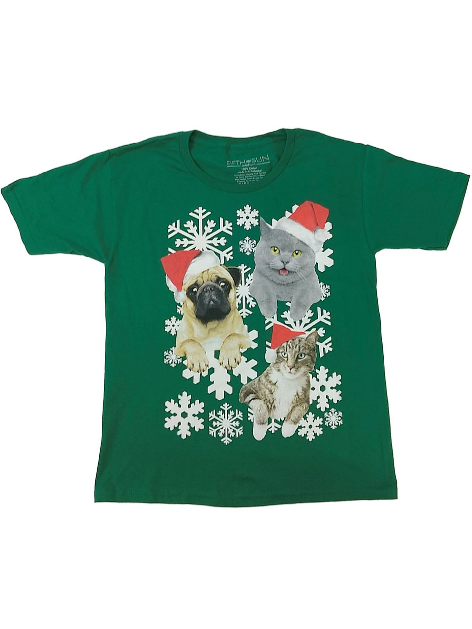 - Boys Green Holiday Cats & Dog Short Sleeve T-Shirt Christmas Snow Tee Shirt