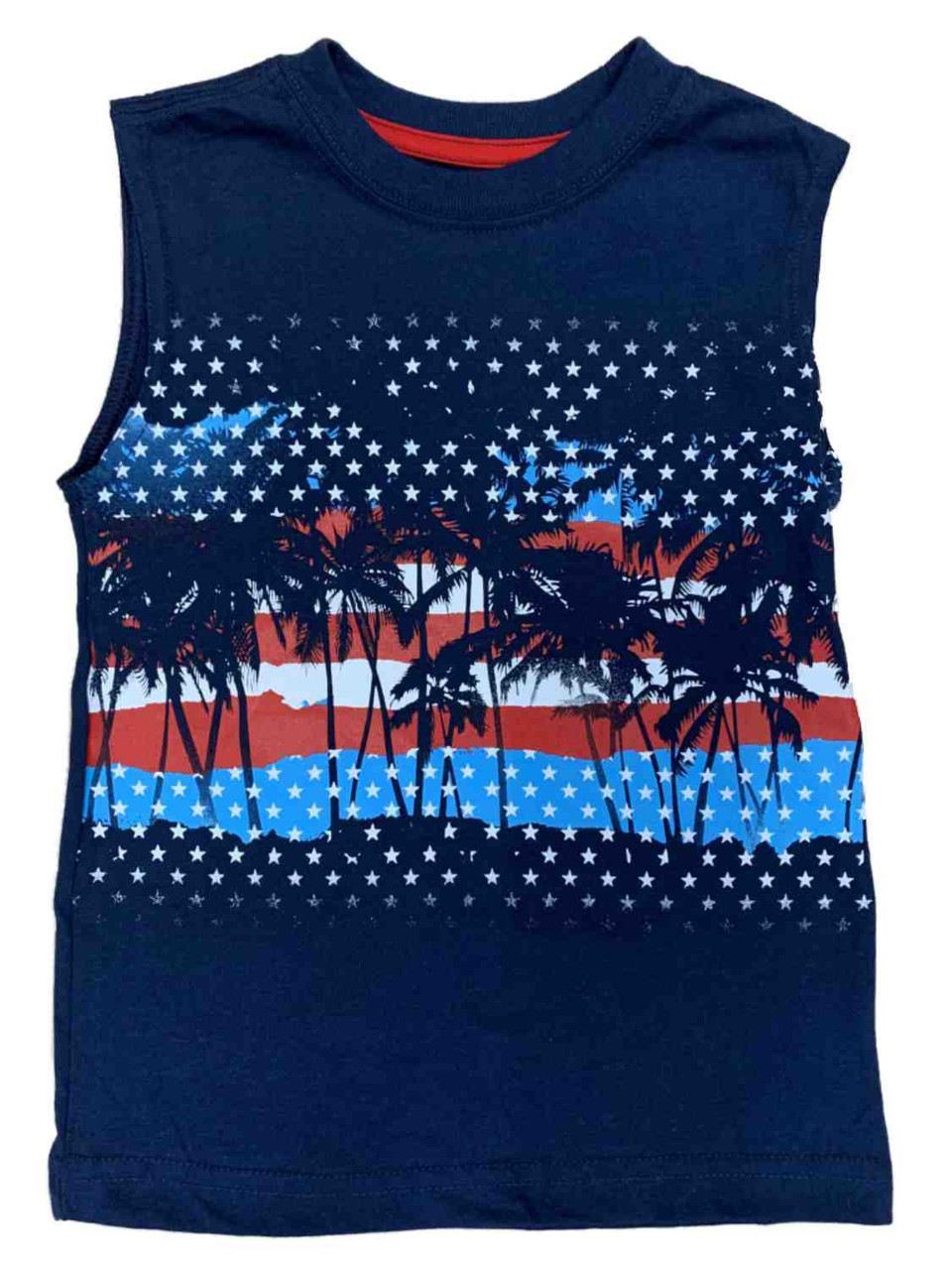 - Boys Navy Blue American Flag & Palm Trees Muscle Tank Top T-Shirt