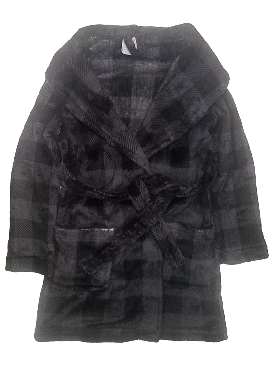 - Boys Plush Fleece Black & Gray Plaid Bathrobe Robe Housecoat X-Small 4-5