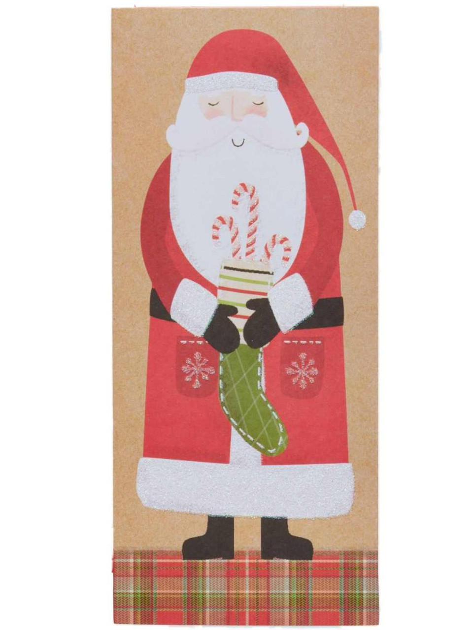 These adorable glittery Christmas cards feature Santa Claus holding a Christmas stocking full of candy canes.
