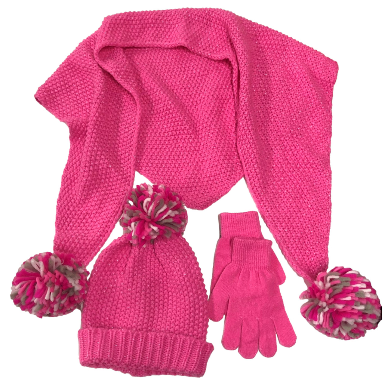 She will stay cozy and warm in this adorable pink sparkle knit traingle scarf, winter beanie hat, & stretch gloves set!