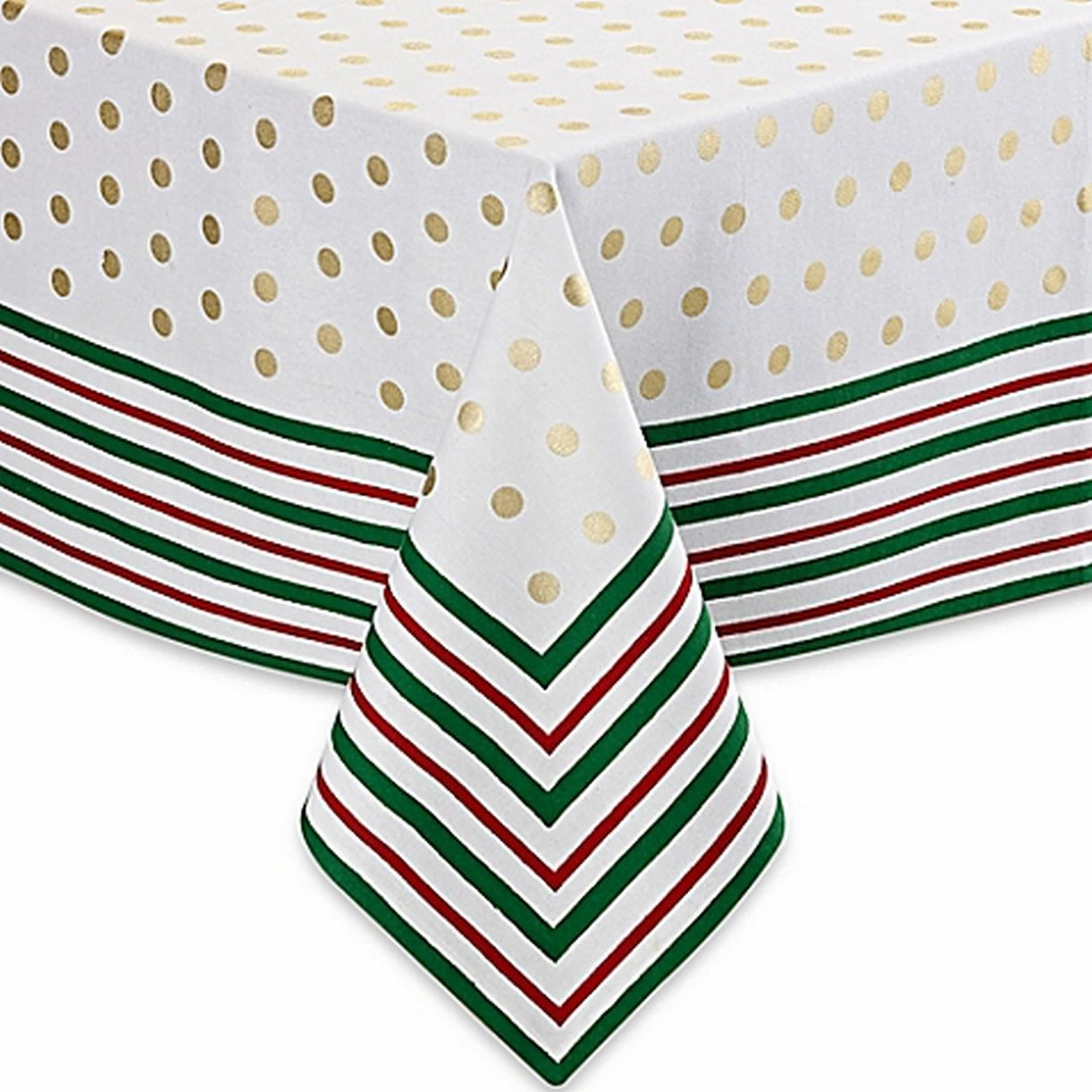 Winter Wonderland Carolina Christmas fabric tablecloth has a great look. It features a pretty pattern of shiny gold dots and green and red stripes on a white background. It will add style to any table