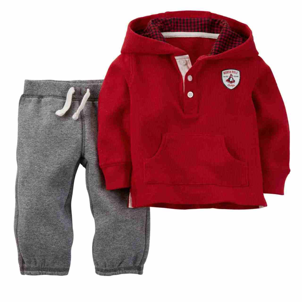 This warm and cozy 2 piece baby outfit includes a red pullover shirt with an applique that says, " North Pole Sled Team Champs," and gray elastic waist athletic fleece pants.
