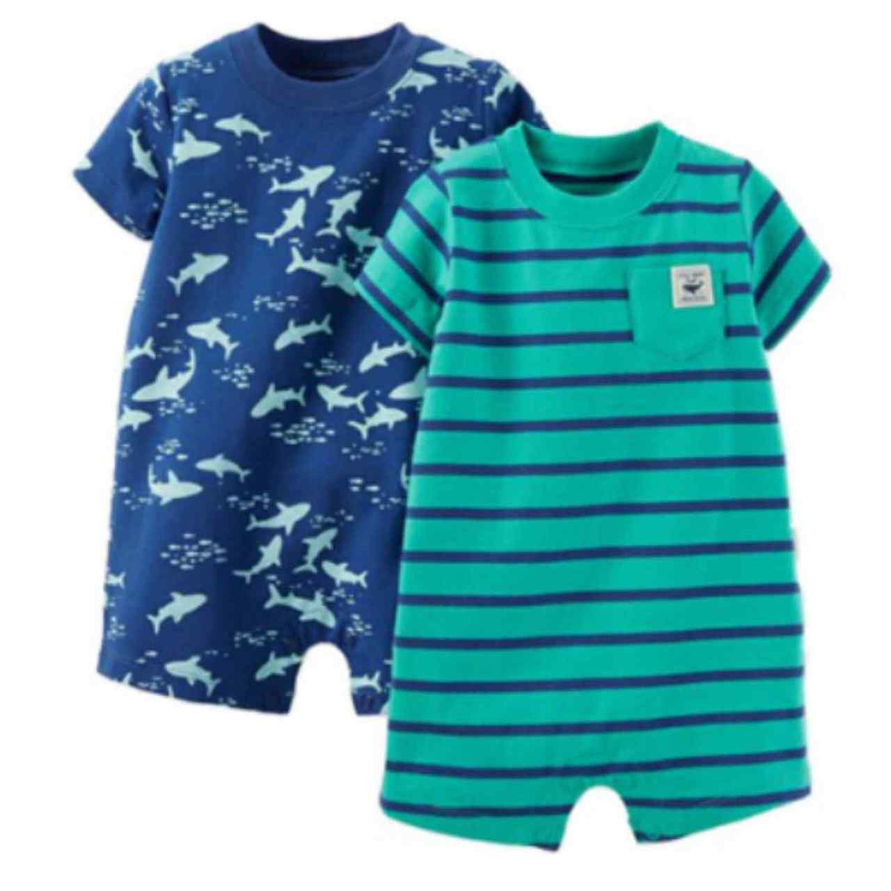 2-pack of adorable rompers by Carters. One is blue striped and the other features shark designs. Perfect for everyday use!
