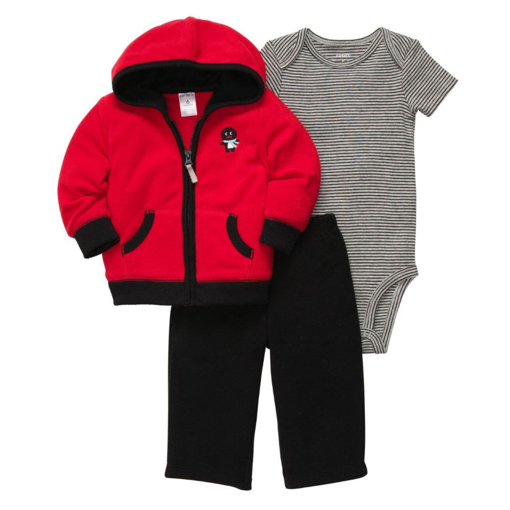 This darling 3 piece Penguin emblazoned baby outfit from Carters features a red fleece hoodie jacket with front pockets, black fleece sweat pants, and a gray striped snap bottom creeper.