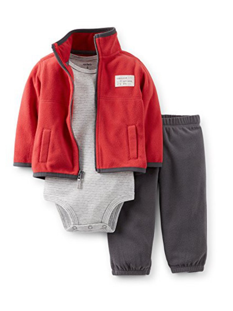 This darling 3 piece "Puppy Patrol" baby outfit from Carters features a red fleece zip up jacket with pockets, gray fleece sweat pants, and a grey striped snap bottom creeper.
