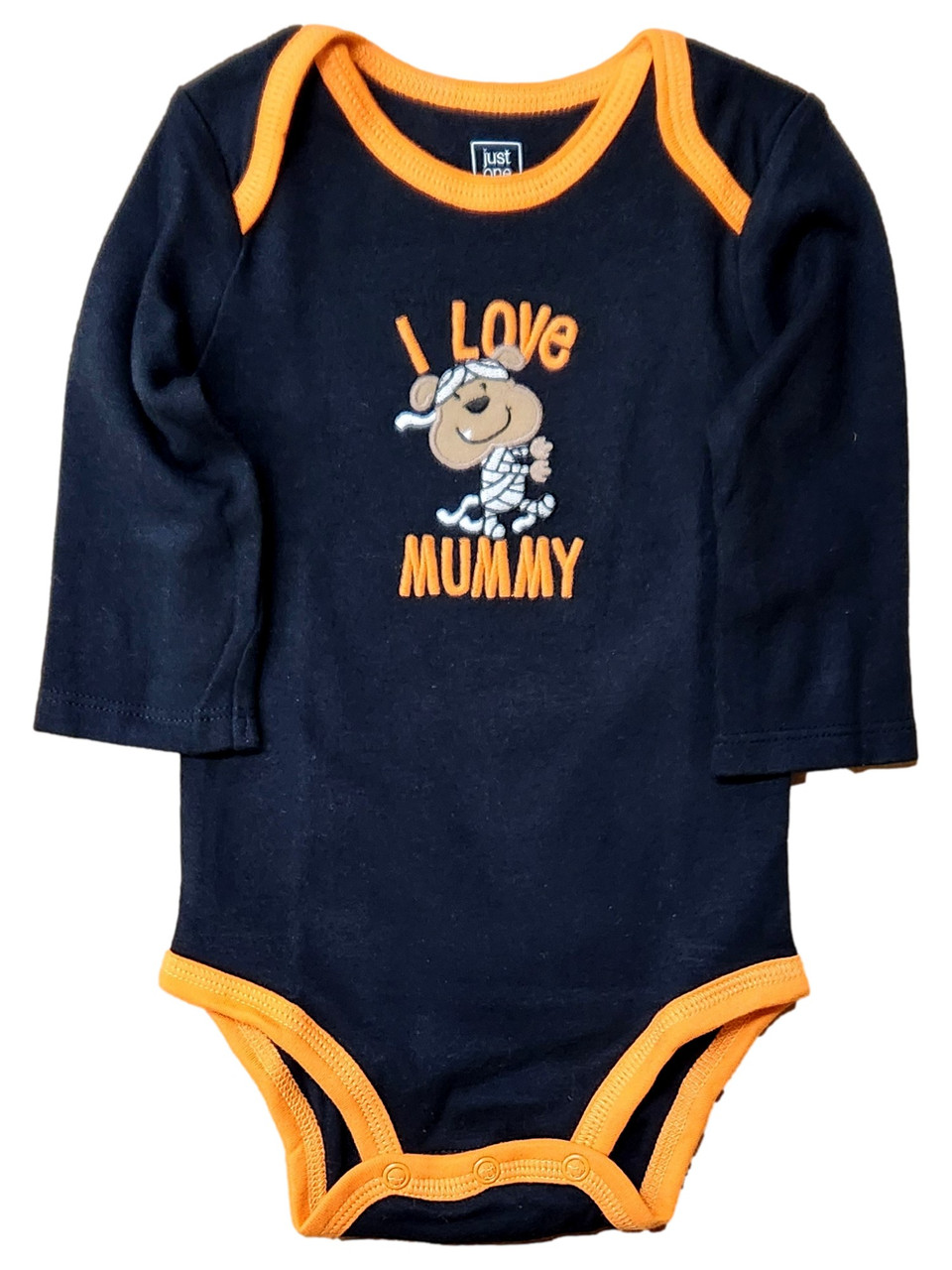 This adorable baby boy's orange "I Love Mummy" bodysuit is sure to be a favorite for the Halloween season!