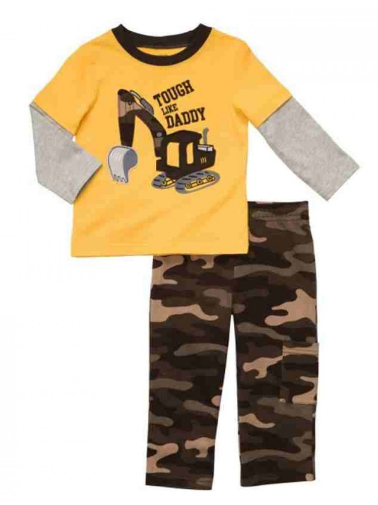 This darling "Tough Like Daddy" 2 piece baby outfit from Carters features a yellow mock layered long sleeve shirt with bulldozer print and camouflage pants.