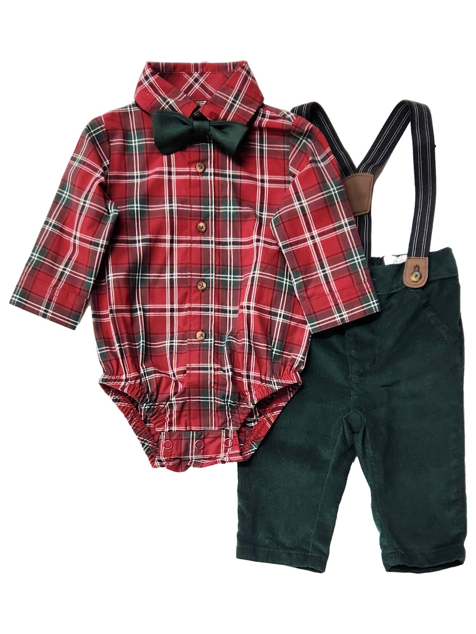 This cute baby boy's outfit includes a red plaid bodysuit shirt, green corduroy pants, & suspenders.