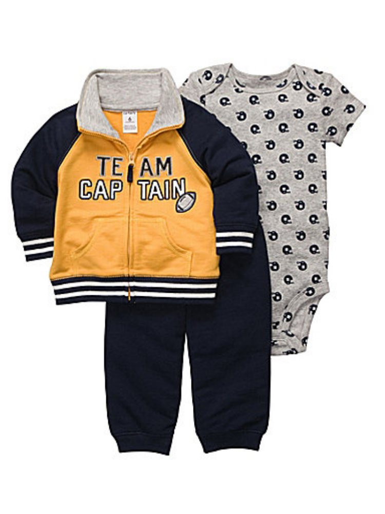 This darling 3 piece Team Captain emblazoned baby outfit from Carters features a yellow varsity jacket with front pockets, blue cotton sweat pants, and a gray snap bottom creeper with football helmet prints.