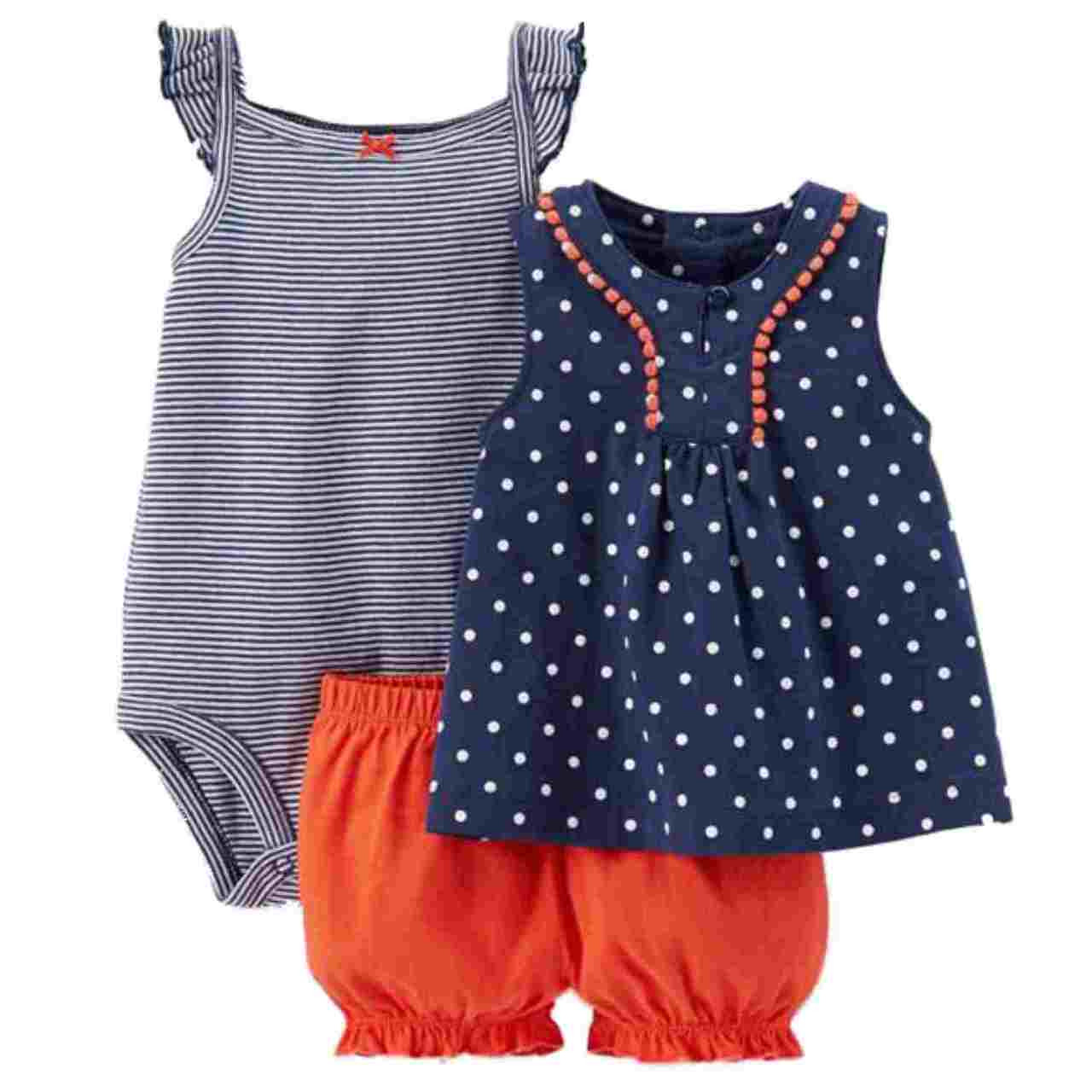 This adorable baby girl's outfit is sure to get lots of compliments! It includes a blue with white polka dot print sleeveless top with front gathers and three snap placket back closure; a blue and white striped snap bottom bodysuit with short flutter sleeves; and a red diaper cover with gathers at the legs.