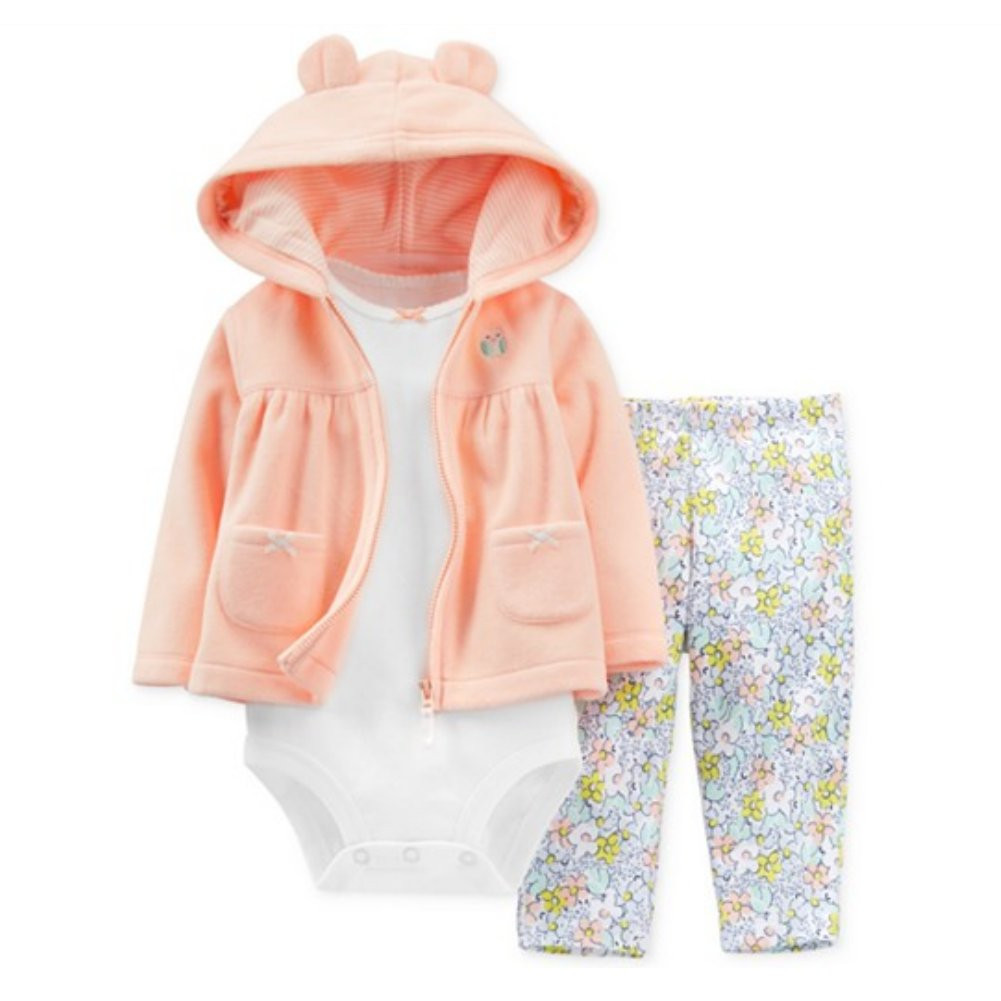 This pretty 3 piece baby outfit features a plush peach owl themed zip front hoodie, a white snap bottom creeper style t-shirt, and colorful floral elastic waist leggings. It is so cute, you will dress her in this one often!