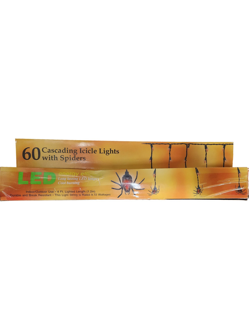 This fun and spooky cascading icicle style light strand has 60 red bulbs each end bulb has a black spider illuminated by the bulb to add to your Halloween decorations.!