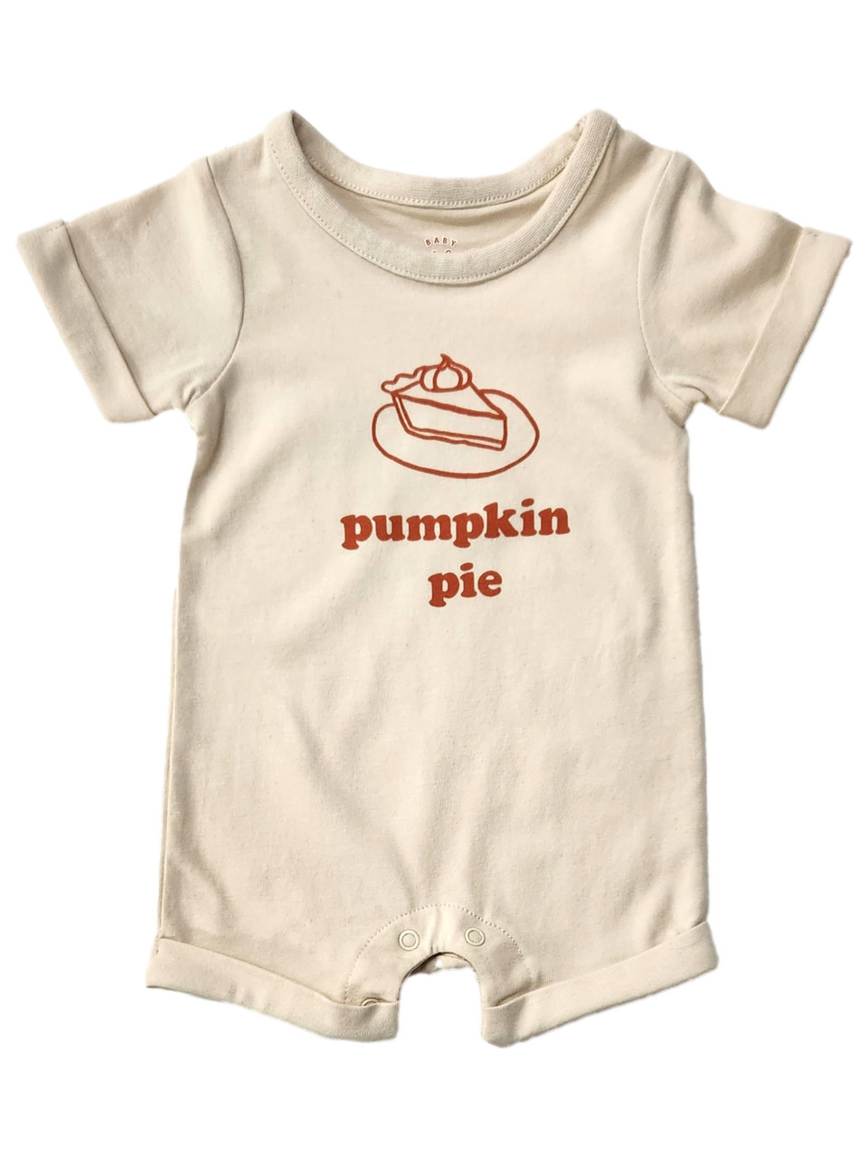 Your little one will look adorable in this fun beige pumpkin pie snap bottom romper baby outfit!