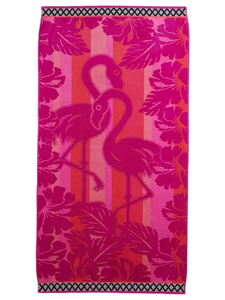 This cotton velour pink flamingo beach towel has a great look. It features a tropical pattern of a hot pink flamingo on a pink and orange background with trim accents at the ends. It is just what you need for the beach or pool