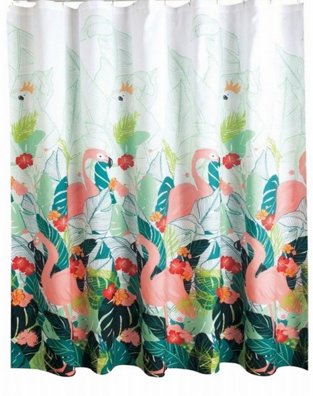 This Celebrate Summer fabric shower curtain has a great look. It has a tropical pattern with pink flamingos!