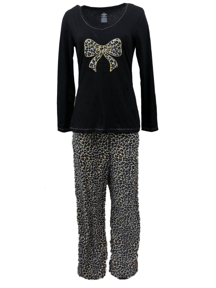 - Celestial Dreams Womens Brown & Black Leopard Print Pajamas Fleece Pajama Set
