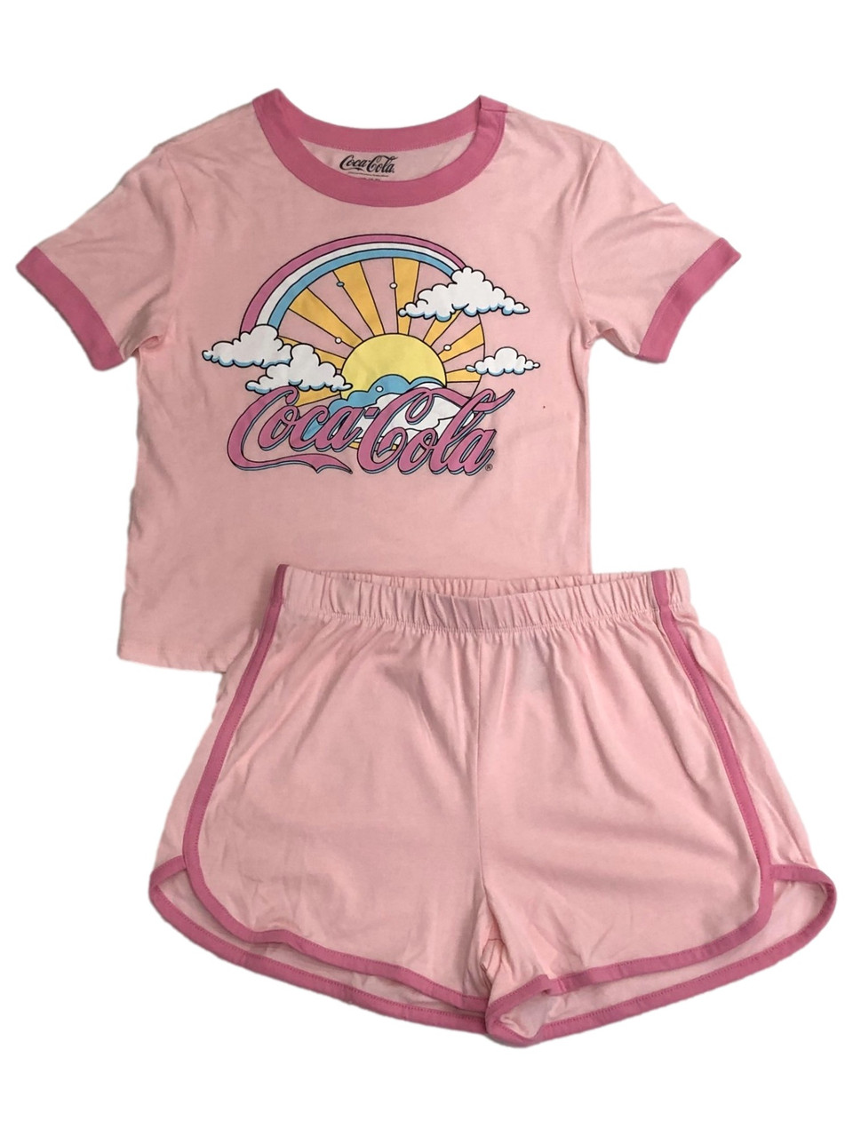 You will love wearing these fun pink Coca-Cola themed pajamas with a rainbow & sunshine themed t-shirt & elastic waist shorts!
