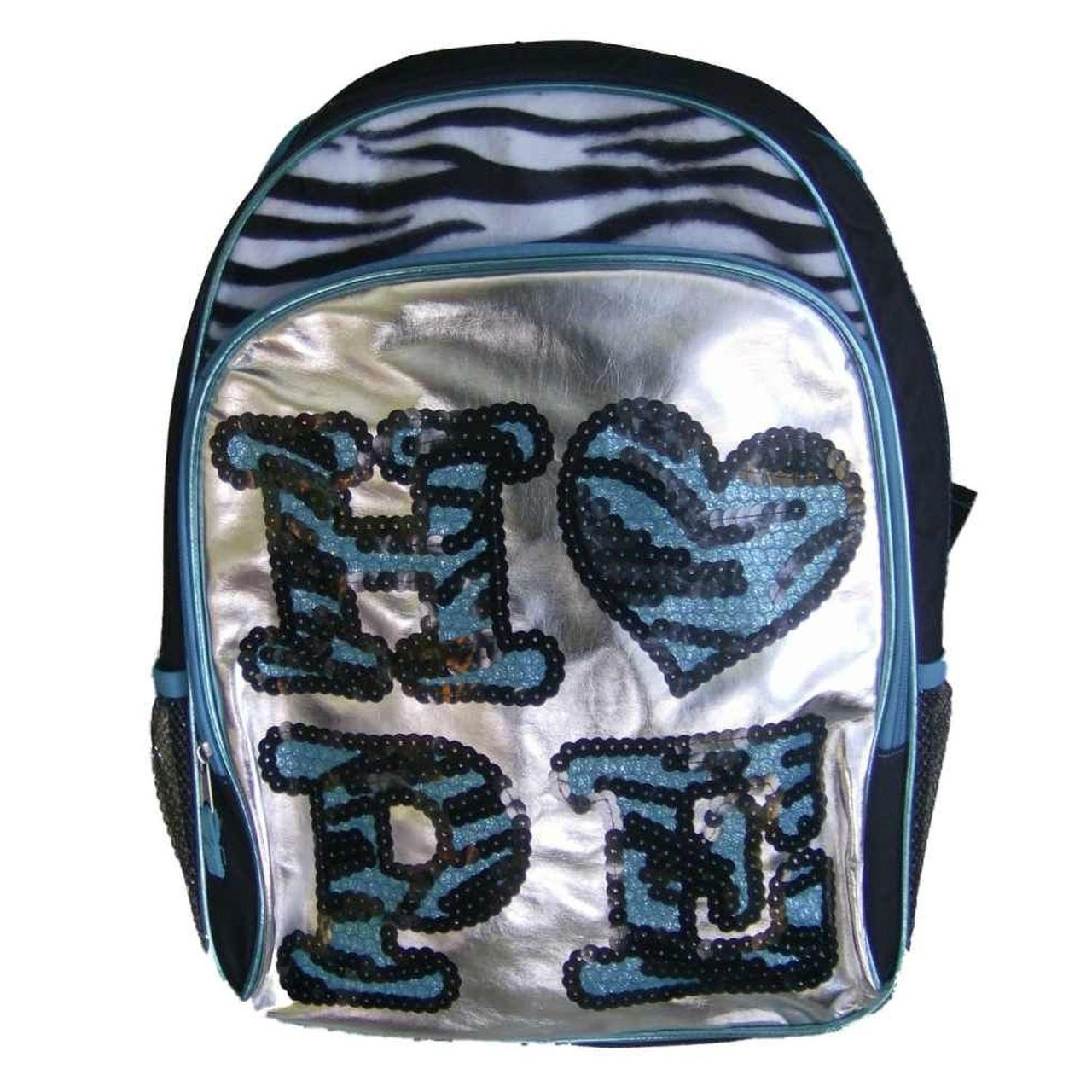 This Confetti Hope backpack features a combination of zebra print, silver and blue with sequin accents. It is well made and perfect for day trips or school