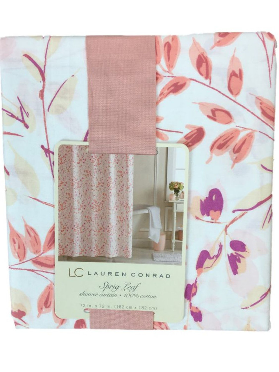- Lauren Conrad Coral & Pink Sprig Leaf Cotton Shower Curtain Botanical Bath Decor
