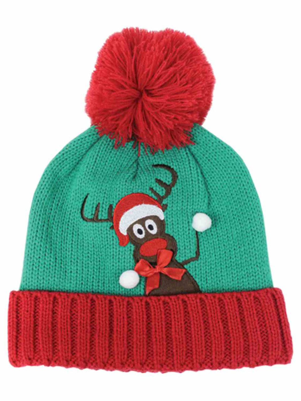 This cozy green pom reindeer themed knit stocking cap is sure to be a favorite!