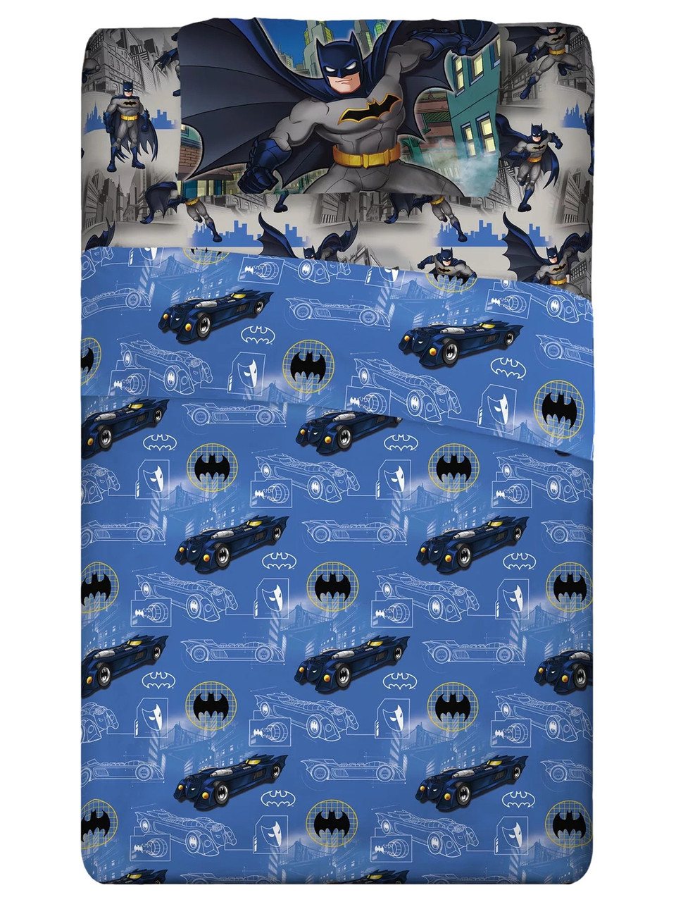 This DC Comics Batman microfiber full sheet set is super soft and comfortable. It features the Batman in action in shades of blue, gray and black. The set includes one flat sheet, one fitted sheet and two pillowcases