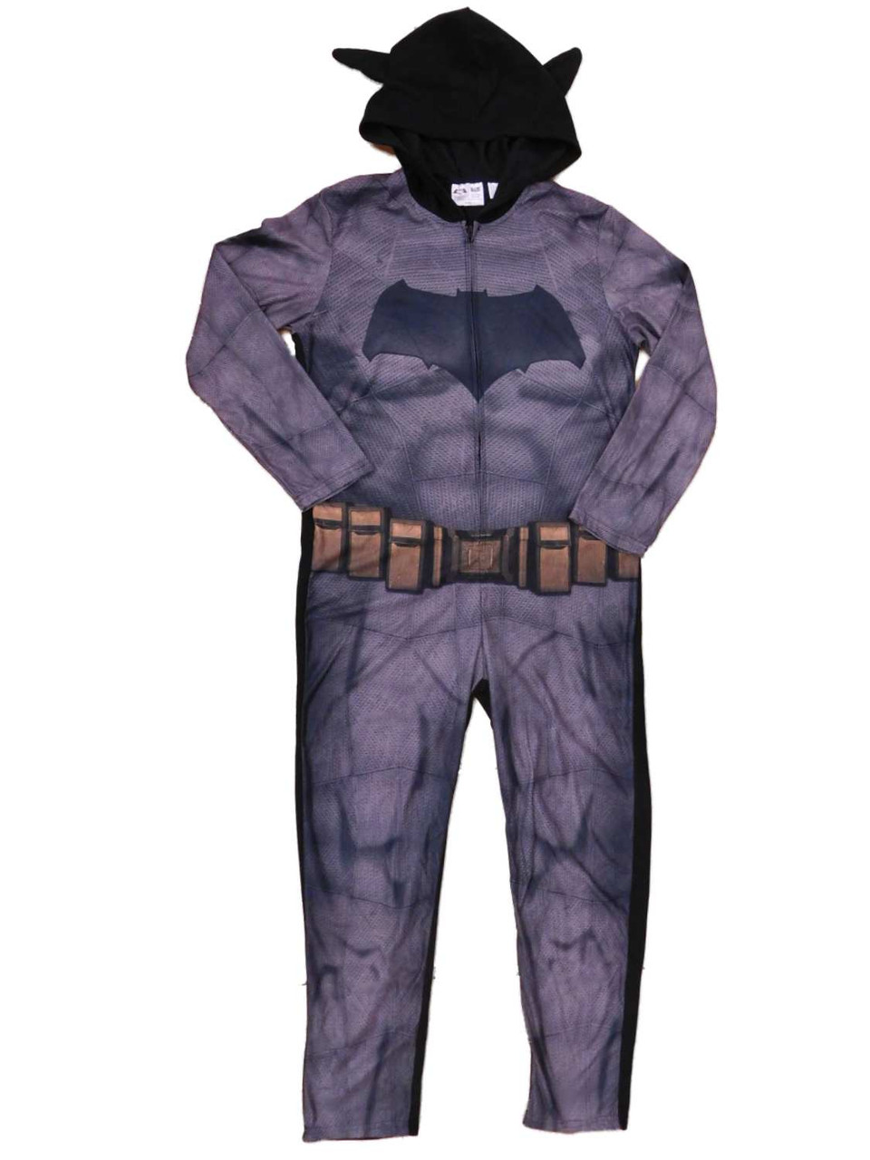 Dress up and lounge around as Batman in this full length fleece union suit with zippered front, bat eared hood and attached cape! Batsuit design on front.