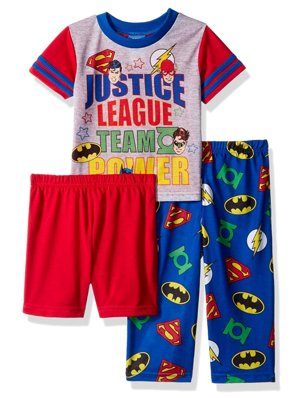 This 3-piece Justice League pajama set includes a t-shirt, shorts and pants. Features the superheroes Superman, The Flash, Batman & Green Lantern.