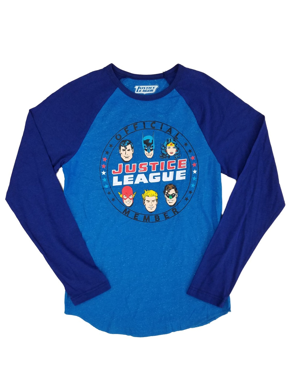 - DC Comics Mens Blue Justice League Official Member Raglan Long Sleeve Shirt