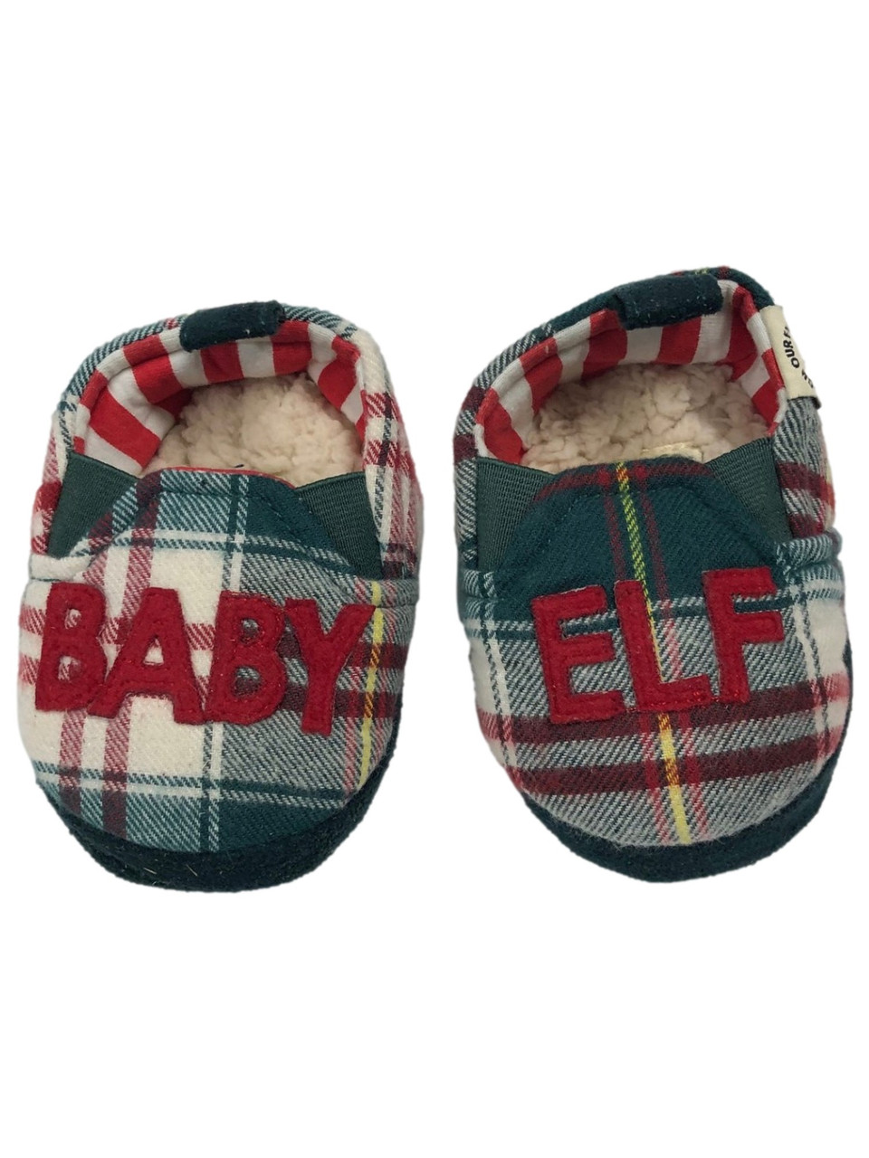 Your little one will be ready for the holidays in these adorable green plaid sherpa lined "Baby elf" Christmas slippers!