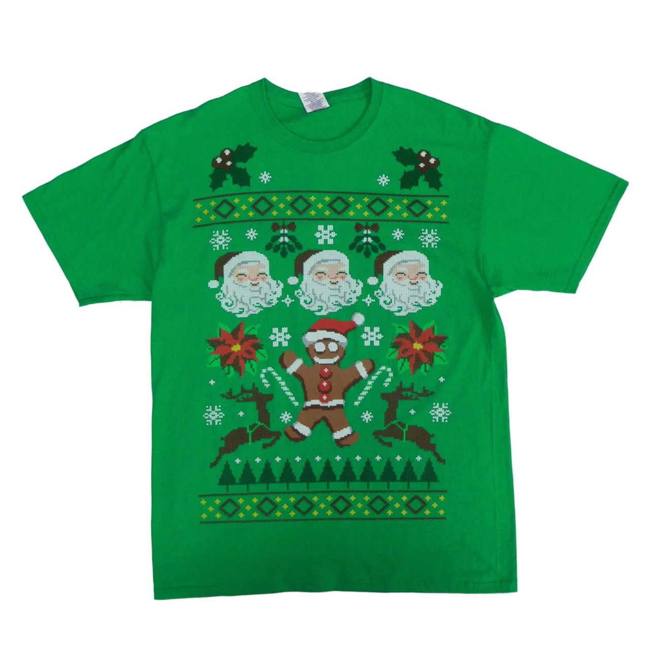 This ugly Christmas t-shirt is patterned with Santa Claus, reindeer, gingerbread man, mistletoe, etc. Design on front.