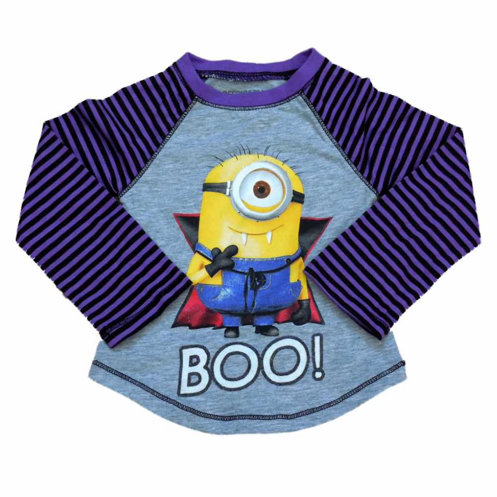 This cute infant & toddler girls Halloween shirt features the word "Boo" along with a little minion dressed up as a vampire and ready to trick or treat. It is sure to be a Halloween favorite!
