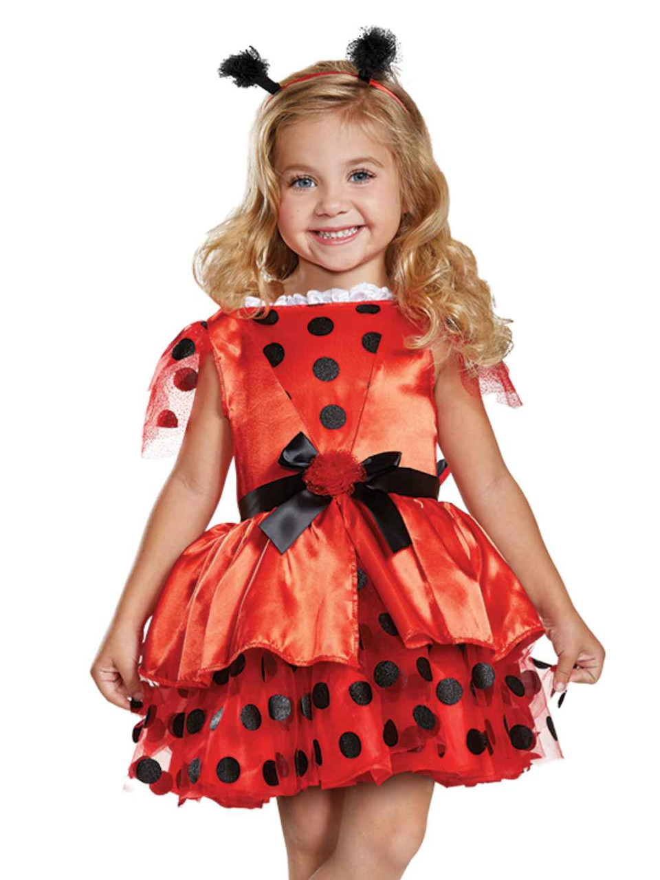 This darling red and black polka dots ladybug costume is so cute, you won't want to change her out of it