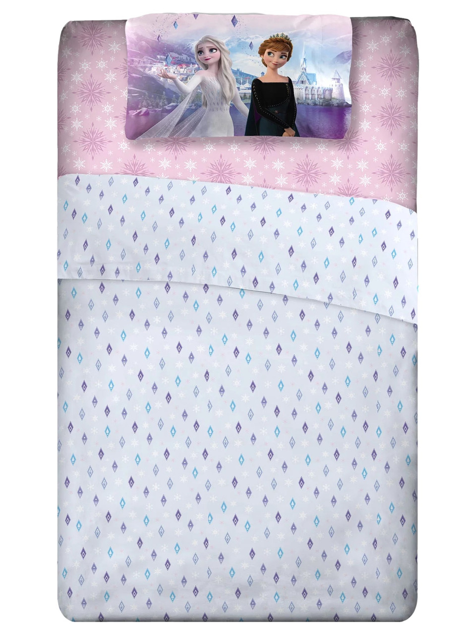 - Snowflake pattern in shades of pink, purple and blue. The reversible pillowcases feature Anna and Elsa