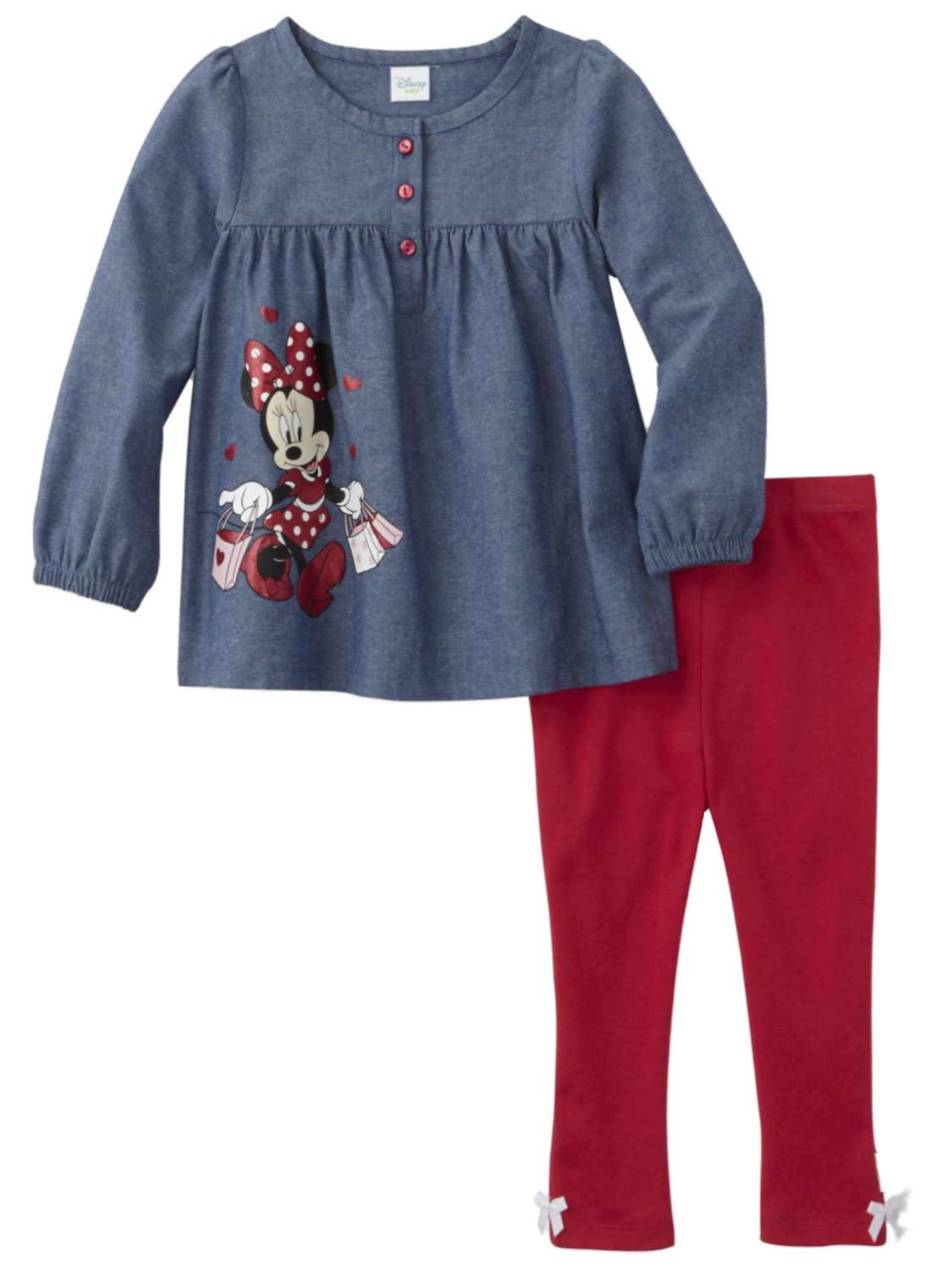 This adorable 2 piece baby girl's Minnie Mouse outfit includes a blue chambray shirt & hot pink print stretch fit legging pants.