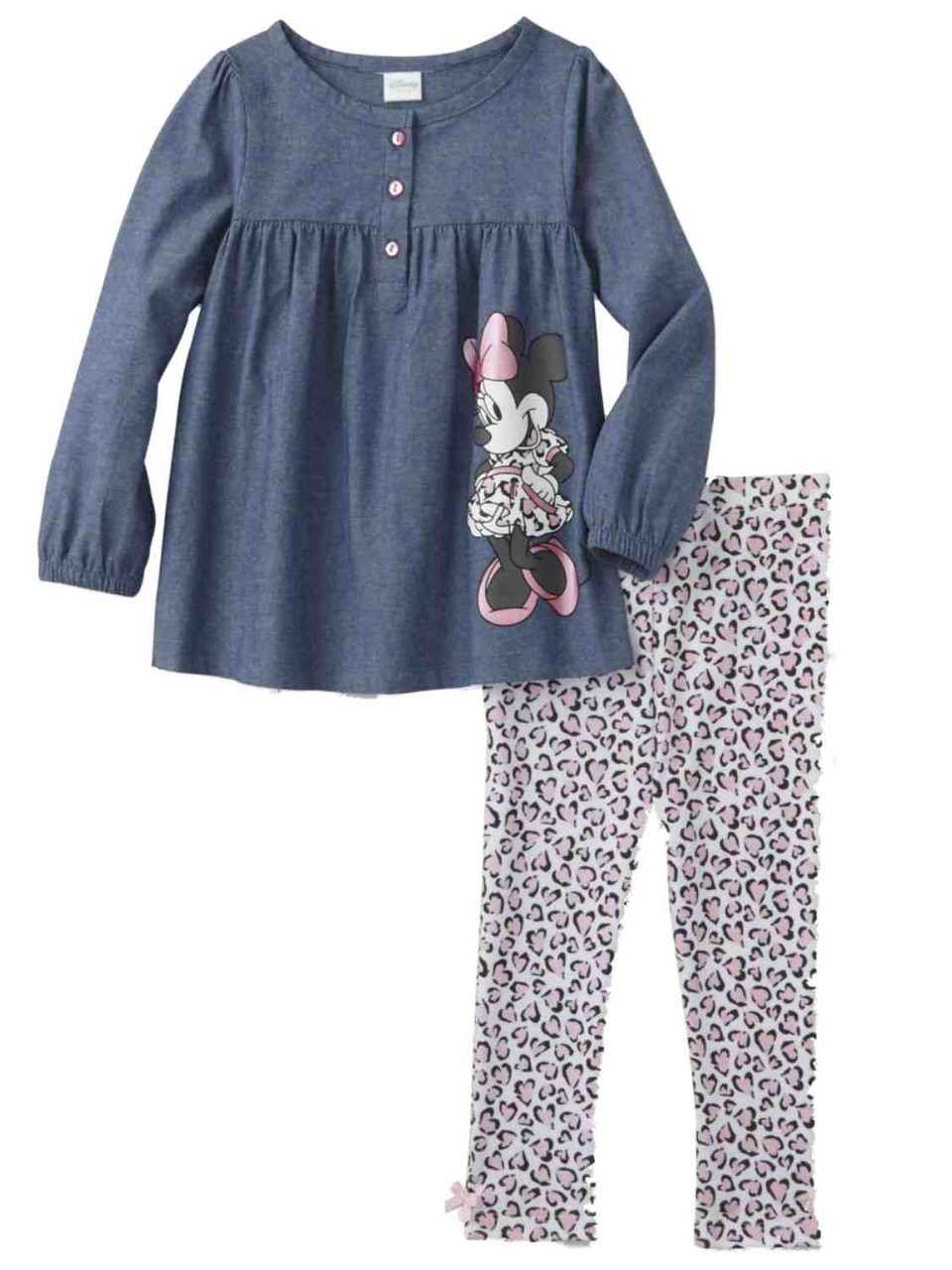 This adorable 2 piece baby girl's Minnie Mouse outfit includes a blue chambray shirt & pink leopard print stretch fit legging pants.