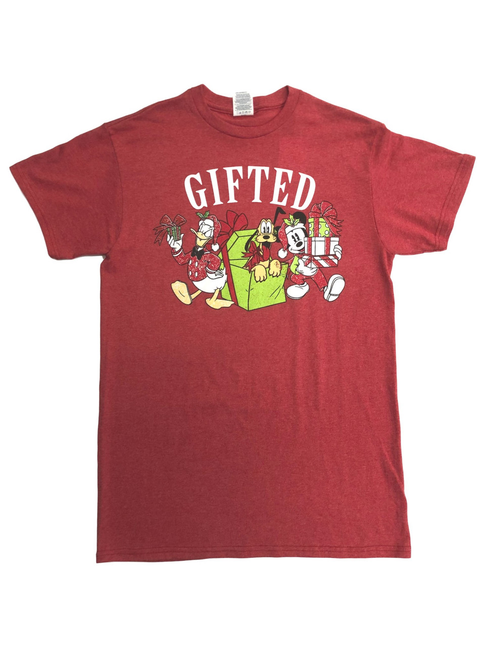You will love wearing this fun red Disney Mickey Mouse, Donald Duck, and Pluto t-shirt this holiday season!