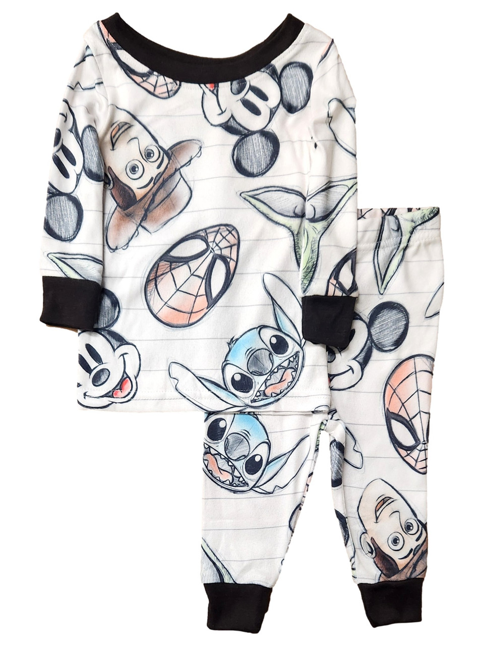 Your little one will be ready for bed in this cute white, Yoda, Stitch, Mickey Mouse and friends 2 piece pajama set!